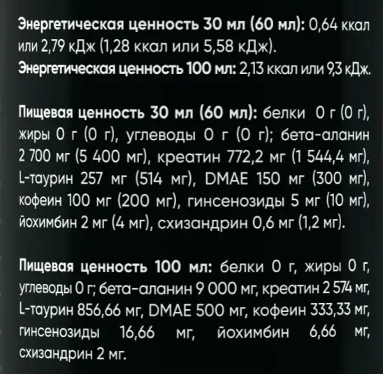 Мощный состав: Каждая порция (30 мл) содержит сбалансированную дозу кофеина (100 мг) для быстрой активации, таурина (772,2 мг) для поддержки сердечной мышцы и нервной системы, L-карнитина и гиперинозидов для улучшения метаболизма и тонуса.