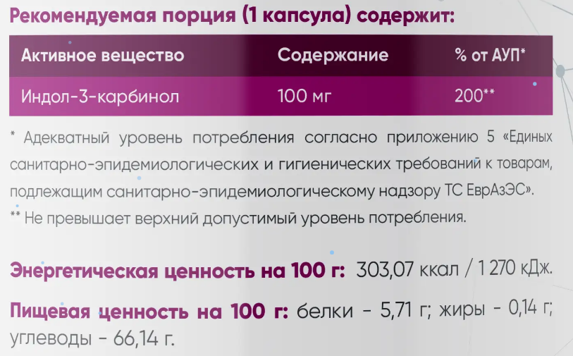 Состав: индол-З-кор6инол, рисовая мука, желатиновая капсула (желатин — загуститель, диоксид титана — краситель), онтислеживоющий огент — диоксид кремния.