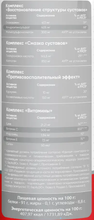 Комплекс «Восстановление структуры суставов» (таблетка белого цвета): глюкозамина сульфат, хондроитина сульфат, метилсульфонилметан (МСМ); наполнители - микрокристаллическая целлюлоза, крахмал; разрыхлитель - тальк; антислеживающие агенты - стеариновая кислота, диоксид кремния.