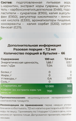 Безалкогольный напиток «Л-Карнитин +Гуарана» обладает ярко выраженным, мягким, пролонгированным тонизирующим эффектом.